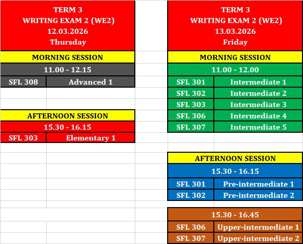 Yabancı Diller Yüksekokulu 3. Çeyrek kapsamında gerçekleştirilecek olan Writing Exam 2 (WE2) sınavı 12 & 13.03.2026 tarihinde gerçekleştirilecektir. Sınav oturum bilgileri aşağıdaki tabloda yer almaktadır.