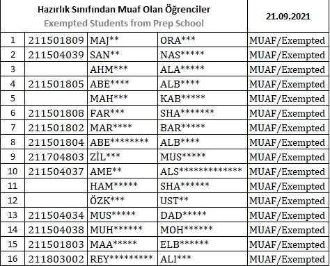 Üniversitemize yabancı öğrenci olarak ve DGS ile yerleşen öğrencilerimiz için 21.09.2021 tarihinde yapılan Muafiyet ve Düzey Belirleme Sınavı sonucuna göre başarılı olan ve Hazırlık sınıfından muaf olan öğrencilerimizin isimleri aşağıda belirtilmiştir. Öğrencilerimize bölüm derslerinde de başarılar dileriz.