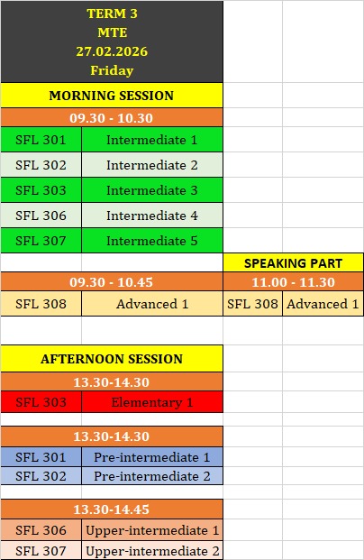 Advanced öğrencilerinin, tabloda belirtilen saatlerde Speaking sınavına katılmaları zorunludur.